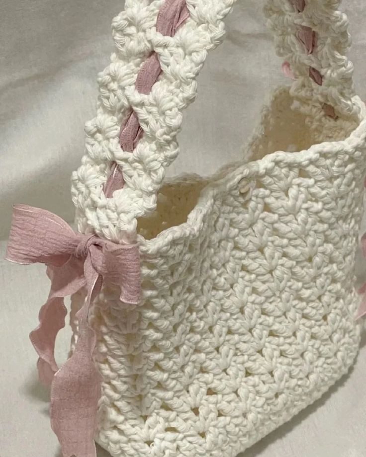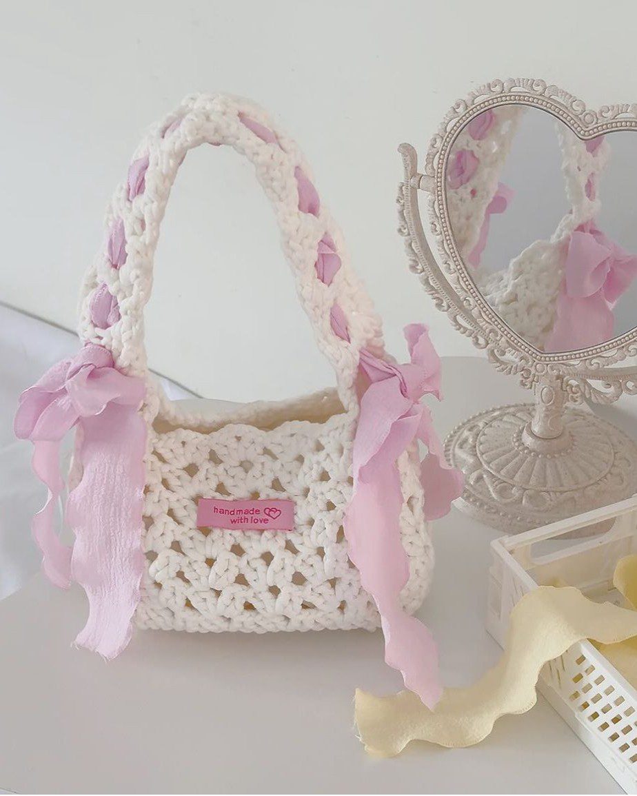 Form túi kẹp nách/đeo vai nhỏ gọn, nơ ruy băng hồng pastel là điểm nhấn độc đáo.